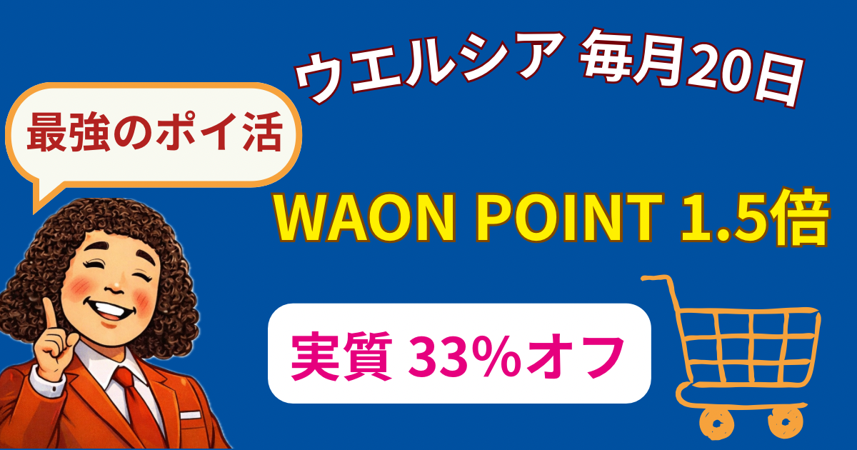 ウエルシアでは、毎月20日にWAON POINTを使うだけで、日用品や食料品が実質33%オフで購入できます。